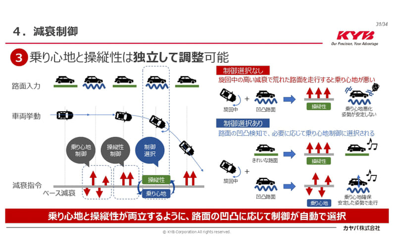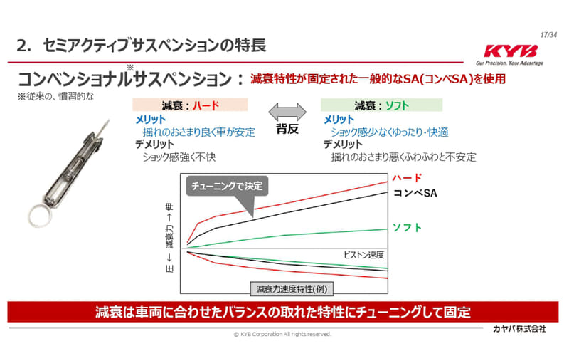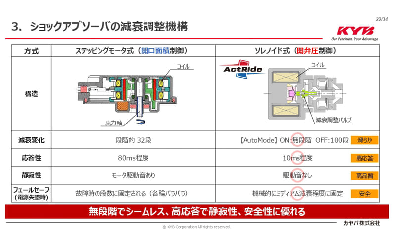 カヤバは1948年から自動車用のショックアブソーバーを手掛けているが、時代と車両の進化と共にショックアブソーバーも進化していて、1982年ごろからはサスペンションロッドの先端を回すことで減衰力を調整できる製品が誕生。また2000年からはステッピングモーターを使い電子制御でサスペンションロッドを回すセミアクティブサスペンションを開発している。