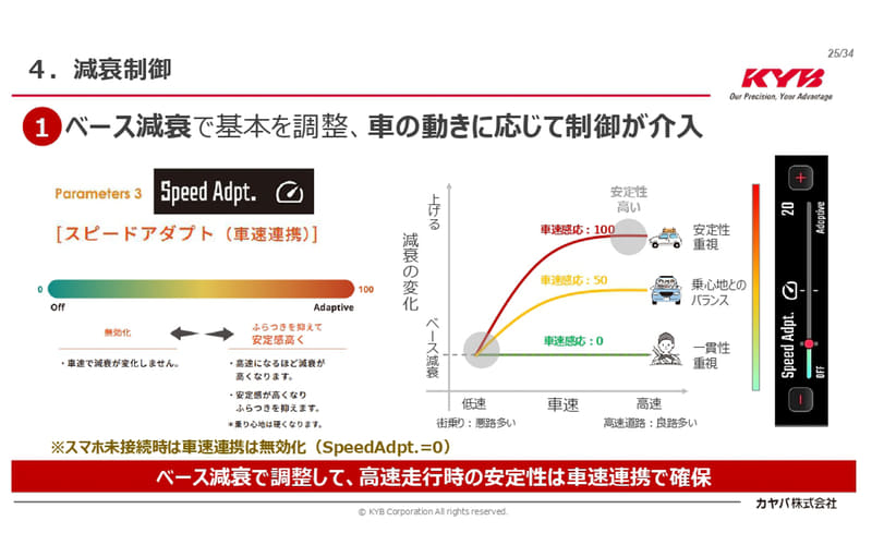 さらに「Speed Adpt(スピードアダプト)」は、スマホのGPS情報から速度データを算出し、車速に応じて減衰力を高めてくれるセッティング項目で、ポインターを右側のAdaptive(アダプティブ)に寄せるほど、高速走行域で減衰力が高くなり、走行安定性を高め、ふらつきを抑制してくれる。ただし乗り心地としては硬くなる方向という。なお、スマホ未接続時はスピードアダプトの機能はOFFとなる。