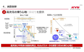 技術統括部 開発センター 製品開発室 専任課長の稲満和隆氏は、「従来の減衰力固定式ショックアブソーバーの場合、低周波が増加するとフワフワした乗り心地になってしまい、中周波が増加するとひょこひょこと揺さぶられてしまうので、車体と空中の間に仮装ダンパーを設定し、それと同じ減衰を発生させるスカイフック制御の技術を使い、低周波と中周波の両方の振動を抑えて、まるで空中から吊り下げられているようなフラットな乗り心地を実現できる」と解説してくれた。