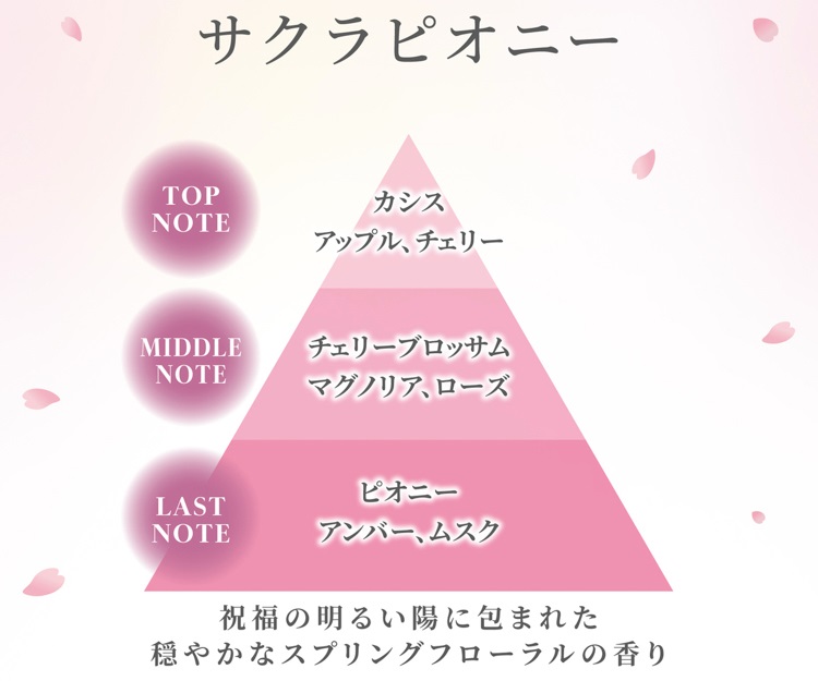 春の定番としてサクラの香りはよくあるが、今回はサクラにバラの香りに似たみずみずしく上品で甘い香りが特徴の「ピオニー(芍薬)」を重ねたペアリング香調を新たに提案。ほんのり甘さのある穏やかなフローラル調の香りが、いつものドライブや通勤時間をほっと心ほどけるひとときにしてくれるという。