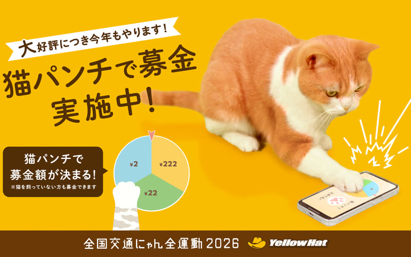 2026年は「猫パンチで募金」初のリアルイベントも開催。人間が猫になりきって猫パンチをして、その得点に応じてイエローハットから保護猫・動物愛護団体へ寄付が実施される。