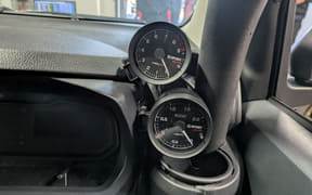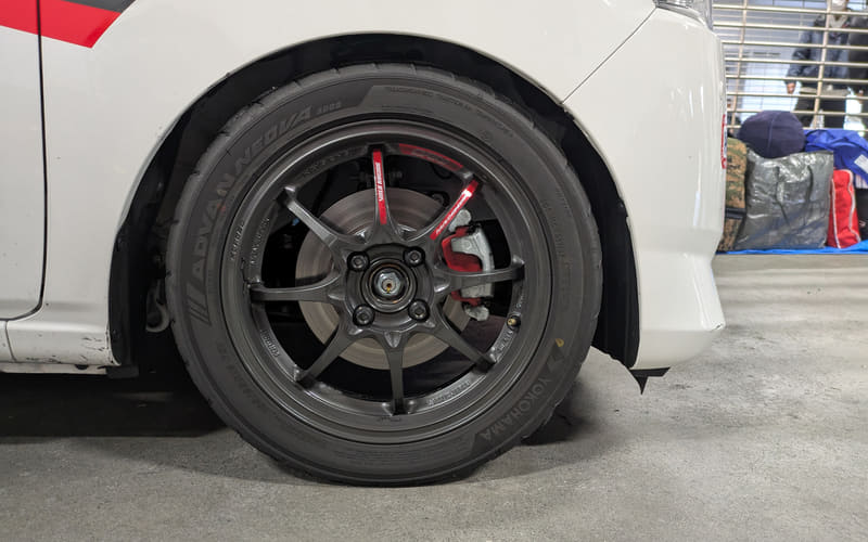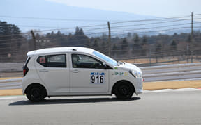 カラーリングのない無地の916号車は、クルマの挙動を感じやすくするのと安全に楽しく走るためバケットシートと4点シートベルトのみ装備しているが、そのほかは市販予定の仕様そのままで、ホイールは鉄チン、タイヤもダンロップのエコタイヤ「エナセーブ EC300+(サイズ155/65R14)」のまま。