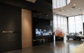 表通りに面したエリアの大半にウォールを設置して内部があまり見えないようにしている独創的なショールームデザインを「ちょっと普通じゃない」と評価。一方で、大きなガラス面に設置したカーテンと壁材や床材などがこだわり抜かれ、広大なスペースを用意していることについて「このレベルで提供しているケースはない」と自信を見せた。まさにマイバッハブランドが掲げる「最高級のラグジュアリー」という価値観を体現しているショールームで、第一印象としては自動車ディーラーのショールームというより高級ブティックに足を踏み入れたような感覚になったと語った。