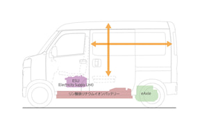 最大積載量350kg、広々とした荷室空間といった軽バンとしての使い勝手のよさはそのままに、モーター、インバーター、トランスアクスルを一体型にした「eAxle(イーアクスル)」を搭載することで軽ターボ以上のトルクを発揮し、EVならではの静かで力強い走りと、停車時、加速時の高い静粛性を実現した。