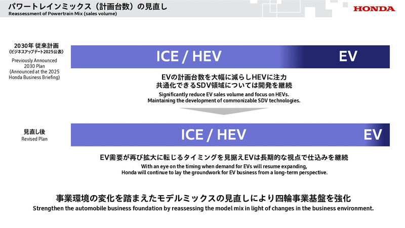 そして、ホンダの現状について、「この競争環境の中で、ホンダは新興OEMなどと比較しバリューフォーマネーのある製品を提供できず、競争力の低下を招きました。こういった変化に対して柔軟に対応できなかったこと、また関税影響により、ICEハイブリッドモデルの収益が悪化したことなど、さまざまな要因により、四輪事業は極めて厳しい収益状況に陥ったと認識しています」と説明した。