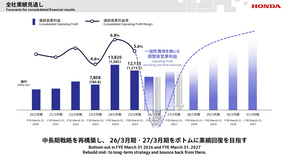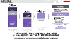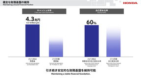 今後のEV投入に関する取り組みは、収益性や需要動向とのバランスをみながら、長期的な視点で柔軟に行なっていくとし、追加的な費用または損失が来期以降に発生する可能性はあるものの、次世代ハイブリッド車をはじめとしたラインアップ拡充で四輪事業の収益改善を図るとともに、二輪事業や金融サービス事業の強固な収益力とキャッシュ創出力により、安定的な株主還元を継続していくとしている。