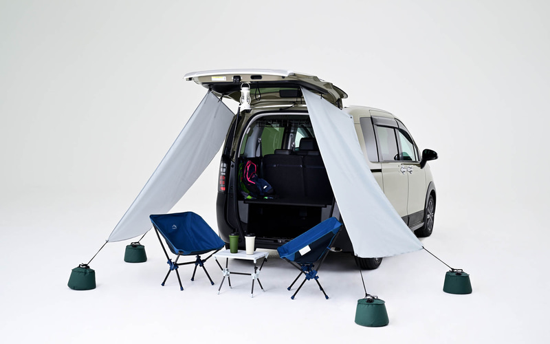 「FREED CROSSTAR(5人乗り)」は、簡単なシートアレンジで後席を広く平らなスペースにできる。今回はミニプロジェクタ―とスクリーンを設置して車内をシアタールームに。車中泊ができるクルマだからこその楽しみかたを提案する。