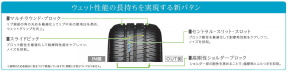 ウェットグリップ性能はワイドセンターリブの両脇に2本のストレートグループを設定した「デュアルアクアトレイル」、両サイドの高剛性ブロックに深く、太く開いた「スラントグループ」によって強化。排水性能を向上させて高い耐アクアプレーニング性能を備え、スラントグループは接地端をテーパー形状化して剛性を維持し、コーナーリング時などのグリップ性能の向上と排水性能力高次元で両立させる。