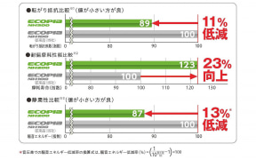 ライフ性能と低燃費性能はエコピア NH200同等レベルとなっており、さらに省資源化では「ISCC PLUS認証」に基づいたマスバランス方式による再生資源を原材料の一部に用いるなど、サーキュラーエコノミーの実現に貢献するタイヤとなっている。