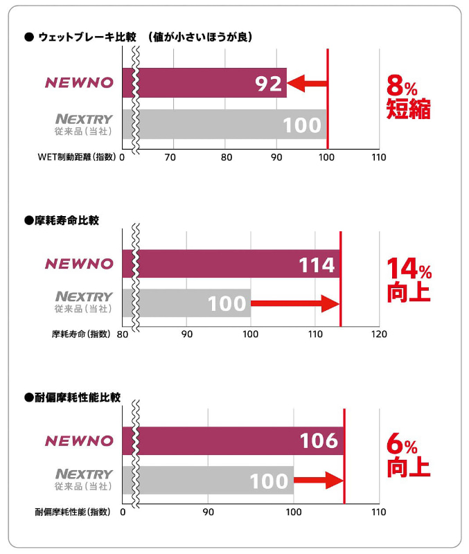これにより、従来品であるNEXTRYとの比較で、燃費性能を維持しながらウェットブレーキ性能が8%向上したほか、摩耗寿命を14%、耐偏摩耗性能を6%向上させている。