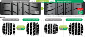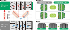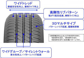 コンパウンドには従来品のECOS ES31にも使われていた「ナノブレンドゴム」を採用して、優れた低燃費性能に加えてウェット性能と耐摩耗性能をバランスよく両立。また、主溝とショルダー溝のバランスを取り、接地形状を最適化したことでウェット性能、耐偏摩耗性能を高めている。