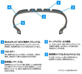 ブルーアース AE-01Fは、全サイズでタイヤラベリング制度の転がり抵抗性能で最高評価となるAAAを達成し、従来製品の「ブルーアース AE-01」に「Fuel Saving(燃費を抑える)」「Friendly(親しみやすい)」「Fit(ぴったり合う、ふさわしい)」の頭文字であるFを製品名に追加して発売された低燃費スタンダードタイヤ。