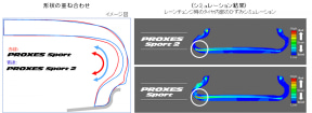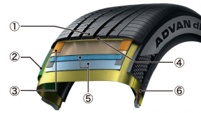 材料技術では、優れたグリップ力とコントロール性を実現する可塑剤、横方向の力の伝達を最大に高めるレジン(樹脂)と特殊ポリマーを配合する「リフレックス・コンパウンド」を開発。タイヤの変形に対する抵抗力を高めることでステアリングレスポンスが向上。通常の走行中は機能性ポリマー技術がポリマー鎖の動きを抑制してエネルギー損出を最小限にとどめ、ブレーキング時にはヒステリシスの大きさを利用してより多くのエネルギーを効率よく熱に変換。制動距離の短縮を実現している。
