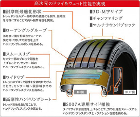 また、高い運動性能と摩耗末期の静粛性を確保した専用の非対称トレッドパターンを採用するとともに、しっかり感としなやかさを両立させ、重量級セダンの荷重にも耐える専用プロファイルを開発。具体的にはブロック剛性を高めつつ、総エッジ量を拡大する「ライトニンググルーブ」、縦長ブロックが周方向の剛性を、横長ブロックが横方向の剛性を高めるコンビネーションブロック「パワーベルトブロック」、タイヤ後方で発生する気流の乱れを抑制する「ディンブルショルダー」などの技術を採用している。