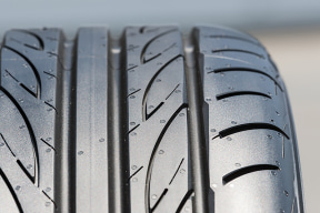 左右非対称のトレッドパターンでは、直線的な4本の縦溝と方向性のあるグルーブのデザインにより、ハイドロプレーニング現象を抑制して濡れた路面での安全性と高いコーナーリング性能を発揮。コンパクトにまとめた非対称のショルダーブロックがハイレベルのハンドリングを実現する。