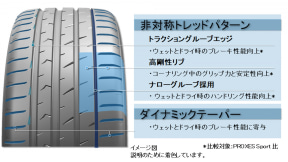 トレッドパターンには独自の非対称パターンを採用し、ドライ性能、ウエット性能、静粛性を追求。タイヤにかかる負荷の変動に応じて接地形状を最適化しつつ、ステアリング操作やブレーキ時のグリップ力と応答性を向上させる「ドライコンタクトプラステクノロジー」に加え、トレッドゴムの柔軟性を高める「新樹脂配合コンパウンド」を使用することで、高いドライ性能を実現しながらウェット性能をさらに強化する「ウェットブレーキングプロテクノロジー」を採用した。