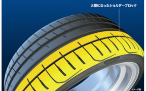 また、アウターセクションのショルダー部では、タイヤの外側に大きな負荷がかかるコーナーリング時の接地面積を最大化するため、大型のショルダーブロックを配置して、アグレッシブなコーナーリングを可能としている。