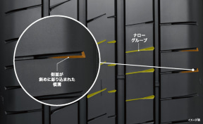 両サイドには幅が可変する横溝を設定し、トレッドブロックの面取り加工を行なって丸みのある形状を与えたことにより、トレッドブロックが地面に接地するときの衝撃をスムーズにして静粛性を向上。また、漸進的に路面に接地するサイプエッジ部の傾斜角を最適化したことでも静粛性が向上している。