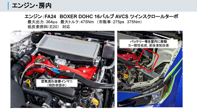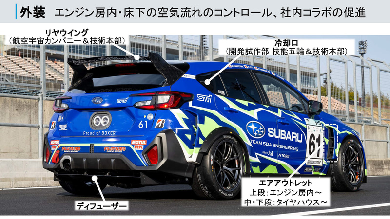 これまでもスバルの航空宇宙カンパニーや技術本部の協力によるリアウィングは投入されてきたが、今回は全面的にスバルとして取り組む姿勢を見せており、資料には開発施策部 技能五輪&技術本部の名前も見られる。この技能五輪メンバーによる作品は、リアサイドウィンドウ後方の冷却口となり、深い絞り込みが行なわれている。