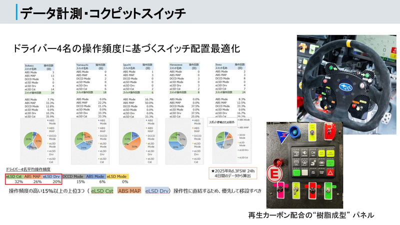 さらにステアリングまわりのスイッチの最適化にも取り組む。ドライバー4 名の操作頻度に基づくスイッチ配置の最適化を行ない、より使いやすいコクピットの実現を模索していく。ここは4人のドライバー(社員ドライバー 伊藤和広・花沢雅史氏、プロドライバー 山内英輝・井口卓人氏)の好みが計測によって出ており、データを取りつつ煮詰めていく部分になる。