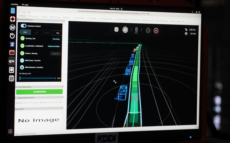 センサー類として、LiDAR、カメラ、RADAR、GNSS・IMUを搭載しており、自動運転ソフトウエアにはオープンソースの「Autoware」が採用されている。自動運転時の最高速度は35km/hで約2時間の充電で運用が可能だ。