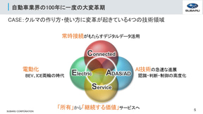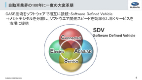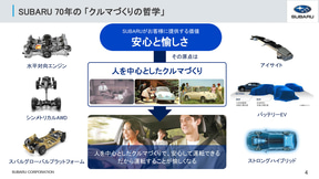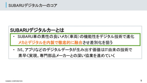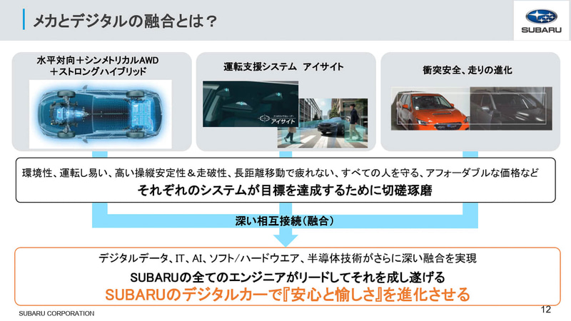 まず、スバルの柴田氏は、「スバルは会社が設立されてから約70年経っております。スバルのクルマづくりの哲学は人を中心としたクルマづくりで、今はそれを“安心と愉しさ”というキーワードで表現しております。スバルの水平対向エンジンやシンメトリカルAWD、スバルグローバルプラットフォーム、アイサイト、バッテリEV、ストロングハイブリッドなど、これまで培ってきたレガシーなメカの技術と最新の技術を組み合わせ、“安心と愉しさ”をデジタル化でいかに実現するかが、今の私の仕事となっております」と、取り組みを紹介。社内には「もっとこういういいクルマを作りたいんだ」というエンジニアが多く在籍しているといい、彼らとアイサイトを含めたデジタル技術を融合させて、今までにないクルマ本来の愉しさを引き上げることが、今のSDV時代にスバルが“安心と愉しさ”を届けられる手段だと考えていると説明した。