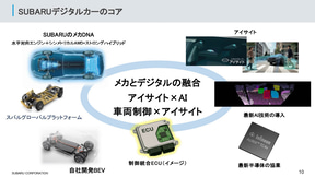 今回の説明会は、3月9日に発表された協業に関するもの。スバルはバッテリEV(電気自動車)とICE車で共用するE/Eアーキテクチャ(車両の電気・電子構成のことで、ECUなどをハーネスで接続したシステム設計構造を指す)の構築に加え、ADAS機能のさらなる高度化における車両制御情報の演算処理での超低遅延化と低消費電力の両立を目指しており、この実現に向けて、インフィニオンの車載MCU「AURIX TC4x」の開発初期段階から設計に参画し、仕様の最適化に取り組んできた。