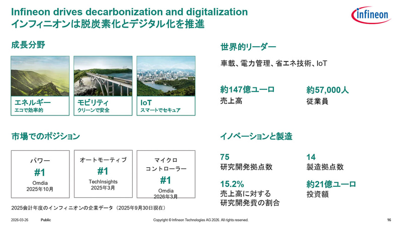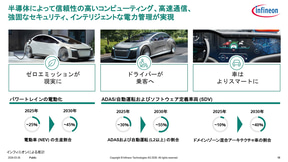 インフィニオンのシェイファー氏は、パワー半導体、車載半導体、マイクロコントローラーの3つの分野でマーケットリーダーのポジションを確保しており、マイクロコントローラー分野では、車載関係だけではなく、産業分野とセキュリティでもナンバーワンになっていると、インフィニオンの半導体業界での位置付けを紹介した。