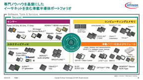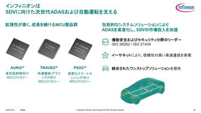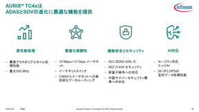 インフィニオンの車載分野におけるMCUは「AURIX」「TRAVEO」「PPSOC」の3製品が用意されており、その中でも、今回のスバルとの協業で用いられる最新世代となるAURIX TC4xは、さまざまなタスクを並列して精度の高い処理が可能な高性能処理、搭載する最大5Gbpsのイーサネットを活用した豊富な接続性、耐量子暗号に対応するとともに世界各国のセキュリティ基準や中国のサイバーセキュリティ基準も満たす機能安全とセキュリティ性、エッジAI対応など、ADASとSDVの進化に最適な機能を提供すると紹介した。