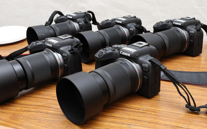 使用する機材はキヤノンマーケティングジャパンから「EOS R10 + RF-S55-210mm F5-7.1 IS STM」、ニコンイメージングジャパンから「Z50II + NIKKOR Z DX 50-250mm f/4.5-6.3 VR」が提供された。どちらも35mm換算で望遠側が300mm以上と十分な焦点距離でありながら小さな参加者でも無理なく扱えるAPS-Cフォーマットの小型軽量ミラーレス機だ。