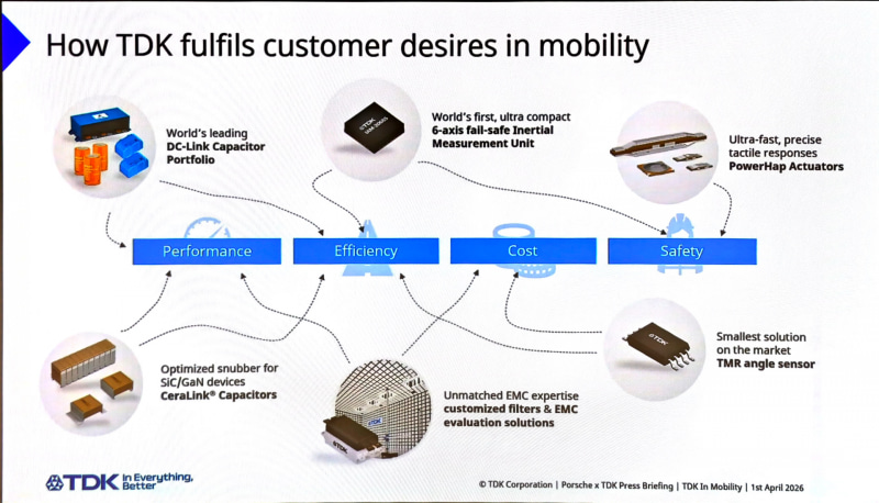 TDKは、かつては一般消費者向けのカセットテープなどで知られているブランドだが、現在はその磁気技術を応用したさまざまな部材(センサーやキャパシターなど)を開発し、それを産業界などに広く提供しているB2B(法人間取引)の企業としてグローバルにビジネスを展開している企業。そうした製品は、自動車メーカーやティアワンの部品メーカーなどが自社製品に取り入れて、自動車や部品の製造に利用している。自動車製造のエコシステムの中で重要な位置を占めているメーカーとなる。