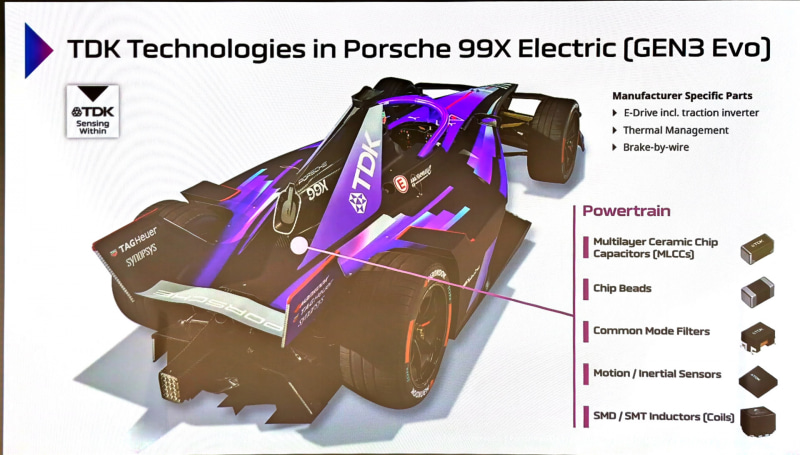 ポチャッコ氏は「TDKにはDC-Linkキャパシター、世界初6-axisフェールセーフ検知ユニット、低遅延で高速な応答性を実現するパワーハプティックス・アクチュエーター、SiC/GaNに最適化されたキャパシター、競合するものがないようなEMC対策ソリューション、TMRアングルセンサーなどのBEVを実現するための各種ソリューションがあり、そうした製品で自動車メーカーやティアワン部品メーカーなどがBEVを構築することを助けている。ポルシェとの協業も同様で、ポルシェが優れたフォーミュラEの車両を構築するのを助けるというのがこのパートナーシップだ」と述べ、TDKがもっているBEV向けソリューションをポルシェに提供しており、それをポルシェのフォーミュラE車両のうち、パワートレーンなどのマニファクチャラーが自分で開発できる領域に採用してもらうことで、ポルシェがフォーミュラEを戦うことを助けていると説明した。