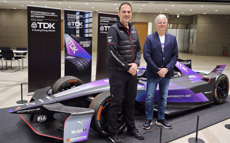 TDKは4月1日、千葉県市川市にある「TDKテクニカルセンター」で記者説明会を開催し、TDK 特命役員 マイケル・ポチャッコ氏、ポルシェ モータースポーツ ファクトリー モータースポーツ フォーミュラーイー 部長 フロリアン・モドリンガー氏が登壇し、同社のフォーミュラEでの取り組みや両者の提携などに関して説明を行なった。