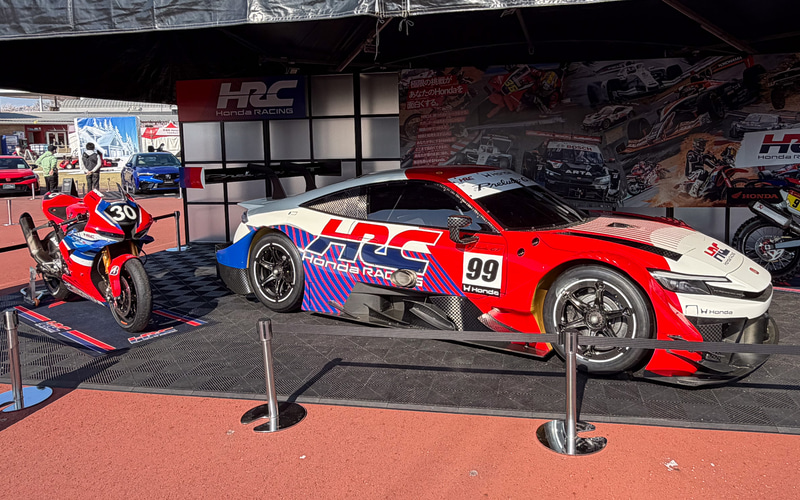 この展示は充実したものとなっており、F1マシンは最新のアストンマーティン・ホンダのリバリーであり、GTマシンは来週開幕するスーパーGTに新規参戦する新型プレリュードGTとなっている。もちろん2&4のイベントであるので、MotoGPマシンや市販2輪マシンも展示されている。