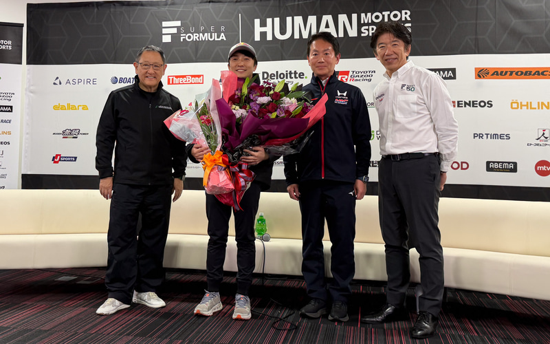 野尻智紀選手、スーパーフォーミュラ参戦100戦表彰式 HRC渡辺康治社長と日本自動車会議所 豊田章男会長も祝福