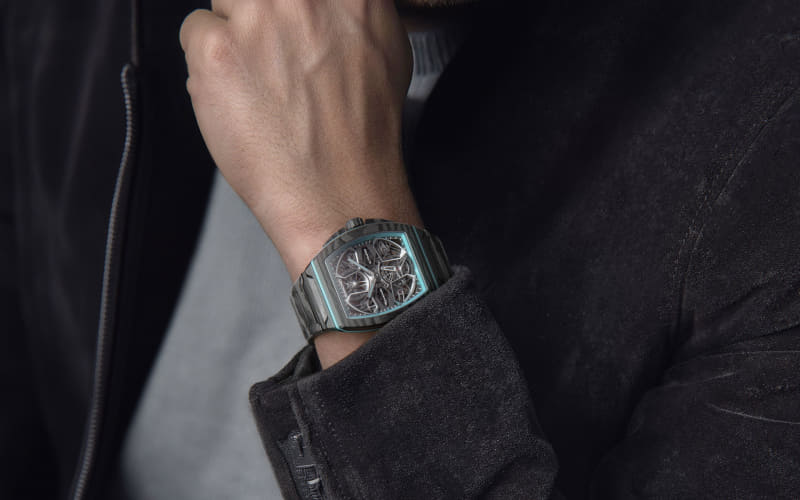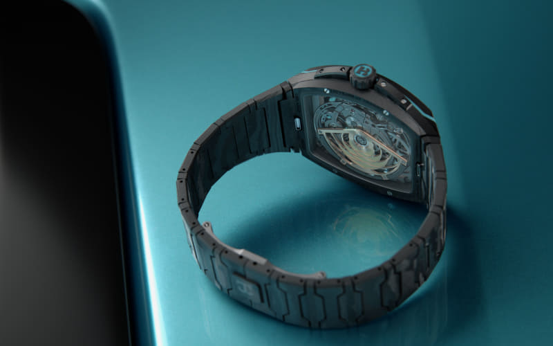 グレード5チタン製のブリッジとメインプレート、高密度カーボンによるケースとブレスレットは、MCプーラのカーボンファイバーシャシーを想起させるほか、可視化されたフライング・トゥールビヨンケージは、ネットゥーノエンジンの鼓動を思わせる存在として表現したという。