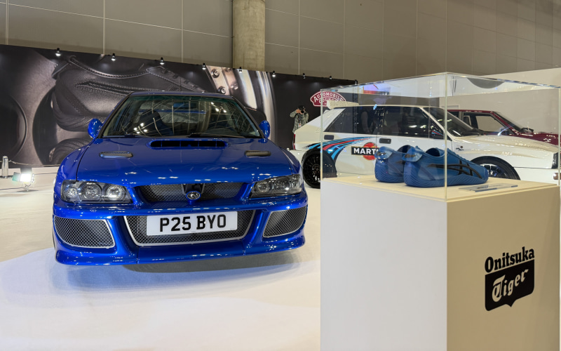 オニツカタイガーは、そうしたレストモッド車両のイメージを反映した赤×黄、ブルー×黒、グリーン、ホワイトの4色のプロトタイプモデルを展示し、クルマの特徴をアクセントの色使いなどで表現した。