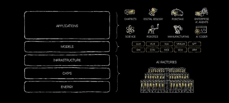 AIファクトリーが建設されているのは、インテリジェンスがリアルタイムで生成されるようになったためです。チップが再設計されているのは、効率性がインテリジェンスのスケールアップ速度を決定づけるからです。エネルギーが中心的な役割を果たすのは、エネルギーがインテリジェンスの生産量の上限を決定づけるからです。アプリケーションが加速するのは、その基盤となるモデルが、最終的に大規模に活用できる閾値を超えたからです。