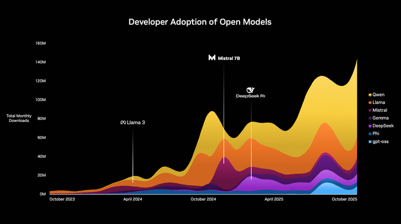 オープンソースモデルはここで重要な役割を果たします。世界のモデルのほとんどは無料です。研究者、スタートアップ、企業、そして国家全体が、高度なAIの活用においてオープンモデルを活用しています。オープンモデルが最先端技術に到達すると、ソフトウェアが変化するだけでなく、スタック全体にわたる需要が活性化されます。