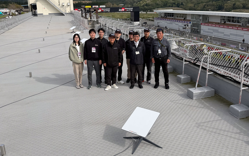 この屋上に設置したスターリンクを日本自動車会議所の豊田章男会長が予選終了後に視察。実証実験に協力してくれたオートポリス、技術的な面で協力したNTTドコモビジネス、モータースポーツ観光推進協議会 代表理事 吉井秀明氏から説明を受けた。