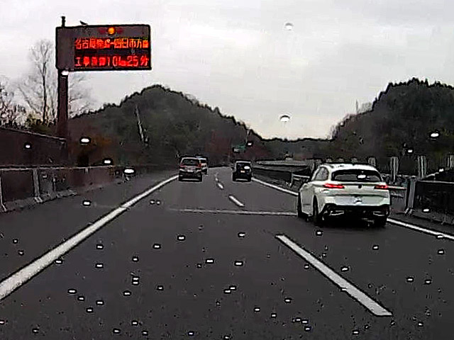 事故現場を通過すると、各車一斉に加速するもすぐにまた渋滞。飛島JCTを過ぎたところの路側帯に黄色の高速道路パトロールカー、発煙筒、その先に事故車両が停止していた。おそらくこちらの事故が先に発生し、先ほど事故を目撃した“ここから”の電光掲示板の辺りまで渋滞。もしかすると、その渋滞の最後尾で先ほどの玉突き事故が発生したかもしれない。この渋滞はその後長くなり、前日の50分を超えたと思われ、関東方面から鈴鹿サーキットに向かう人は、巻き込まれたかもしれない。11時半のFP1(練習走行1枠目)の開始時刻に間に合っただろうか。