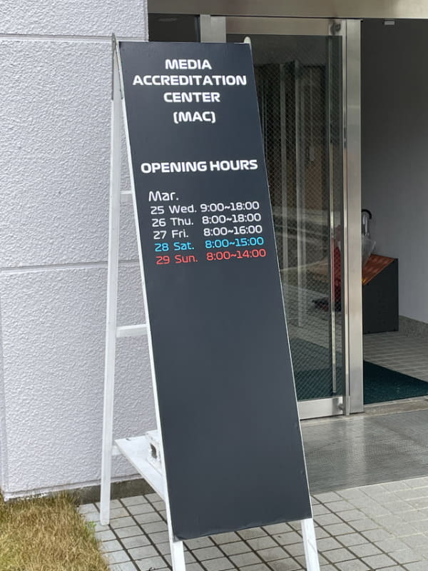 筆者は新名神の鈴鹿PAスマートICへ。昨年とルートは異なるが、美濃加茂IC~鈴鹿PAスマートICは渋滞の影響で30分ほど遅くなった。展示されているF1マシンをチラ見、トイレによってから鈴鹿市内に向かった。昨年同様メディア受付はサーキット前交差点の手前550mくらいにある青少年センター。昨年はサーキット道路でたっぷり渋滞したので、今年は回避ルートを考えていたが、大きな渋滞もなく到着した。鈴鹿PAスマートIC~メディア受付は昨年より14分ほど短縮。トータルで約15分遅れとなった。デグナーカーブの先にある南コース(カートコース)の関係者駐車場にマイカーを駐車し、シャトルバスでパドックへ移動した。