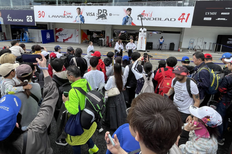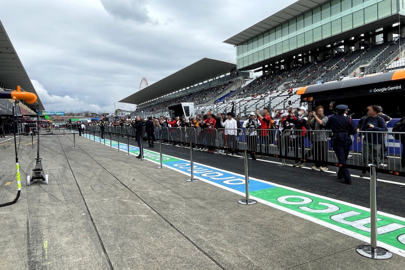 メディアセンターのロッカーに荷物をしまい、ピットウォークが行なわれているピットロードへ。今年は“ノンストップピットウォーク”という名称で立ち止まれない方式。先に到着した知人によると、最初はノンストップだったけど、徐々に渋滞するようになったとのこと。筆者がピットロードに入った11時過ぎには、人気チームの前は完全にストップしていた……。木曜日、平日の午前中だがピットウォークは凄い人。毎年のことだが、海外では木曜からファンが集まることはないと聞くので、日本のF1ファンの熱気が感じられる瞬間だ。