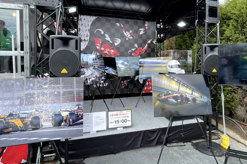 毎年、木曜の夜は高校の同級生のF1仲間との飲み会があり、できるだけ早く名古屋に移動したい。熱田護カメラマンのセミナーは、金曜日~日曜日はかなり混みそうなので木曜日に見ておこうと思い帰り支度をして、荷物を持ってグランドスタンド裏へ。セミナーは木曜でも盛況な印象。ただ、メインステージの音が大きく、後ろの方の参加者は熱田さんの声が聞き取りづらかったかも。