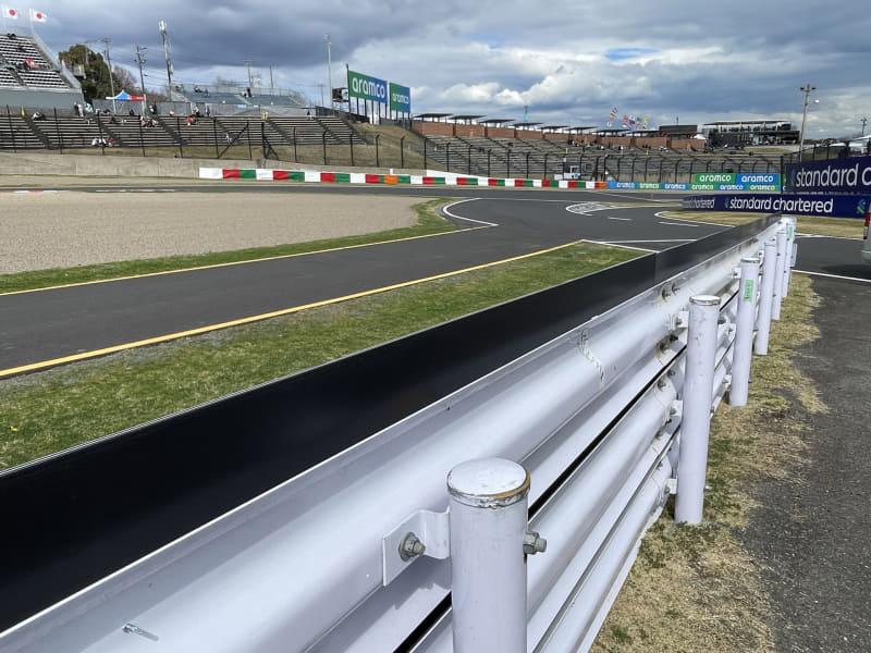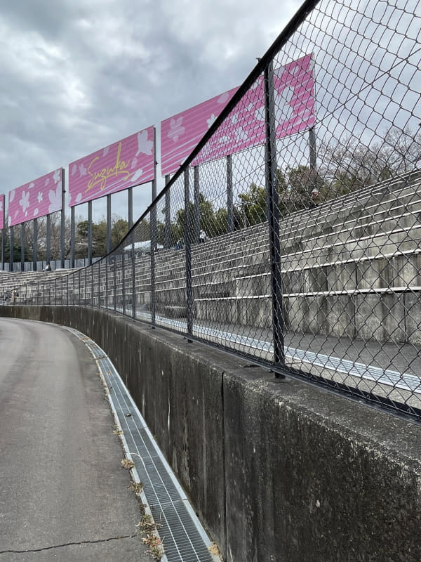 逆バンク、スタンド後ろの看板はSuzuka&さくらデザインになっていた。気になったのはフェンスの色。ヘアピン常設スタンド前(カメラマンエリアのヘアピンプラス)はかなり以前に黒に塗装されたが、逆バンクの金網が黒になったのはいつから? 今年から? 金網が黒く塗装されると観客席からは撮影がしやすくなる。