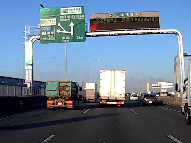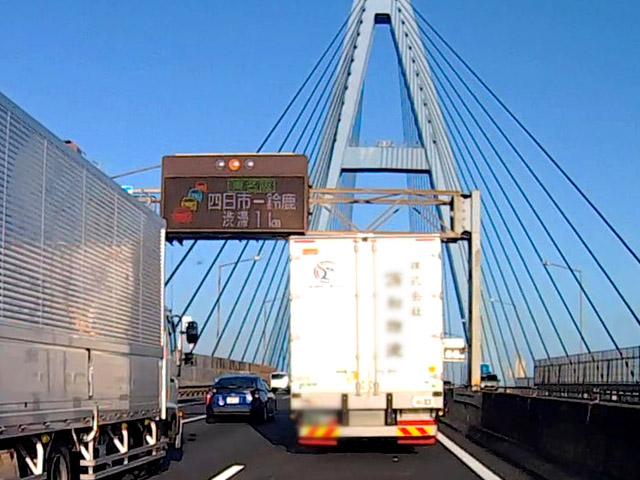 順調に進むと思った矢先、白い橋を越え赤い橋の手前で予告なく渋滞。しばらく渋滞し、追い越し車線のクルマが左のウインカーを出して車線変更。飛島IC・JCTの手前で玉突き事故が発生していた。前日と同様、事故直後で警察など関係車両は到着していない。事故現場の真上に電光掲示板があり「ここから-湾岸弥富 事故渋滞 2km 5分」の表示。どういうこと? 事故現場は“ここ”じゃないの?