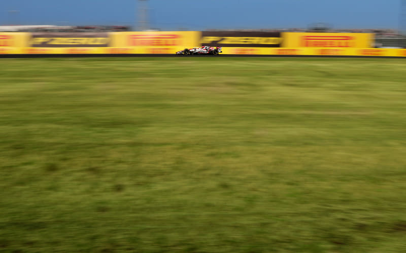 デグナー2つ目は筆者のお気に入りの撮影ポイント。理由の1つ目はコーナーのイン側でマシンの前後(フロントウイング、リアウイング)の被写体ブレが少ない。2つ目は距離が近すぎず遠すぎずマシンの形状が美しく撮れる。3つ目はデグナー1つ目から進入してくるマシンが見えるので撮影するマシンを選択しやすい。最後はこれらの撮影条件がよいので歩留まり(成功率)が高い。望遠ズームで焦点距離148mm、シャッター速度1/125で通常のマシン単独の写真を撮影した。