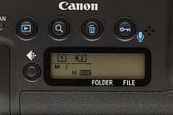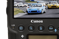 | 1DXでは、再生画像の拡大方法が変更された | 小さな液晶が背面表示パネル。その左に追加されたカード/画像サイズ選択ボタン |
