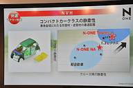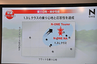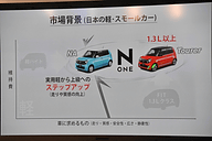 「維持費を優先する人のど真ん中のクルマが、軽のベストセラーであるワゴンR、ムーヴ。走り、広さ、静寂性の1つ以上許せない人のど真ん中のクルマが、コンパクトカーのベストセラーであるフィット」と言い、その間にある壁を突き崩すクルマがN-ONEであると紹介した。