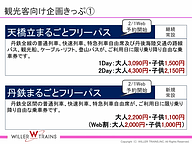 また、丹後神野など7駅を地域住民が分かりやすいように改称する。さらに1日乗り放題などの企画乗車券は「家族がみんなで楽しめる鉄道」をコンセプトに地域住民が利用しやすいように花見時期や祭事に併せて新規19、継続6と25もの商品を発売する予定。一部は2月1日よりウィラートラベルで予約販売を開始する見込み。
